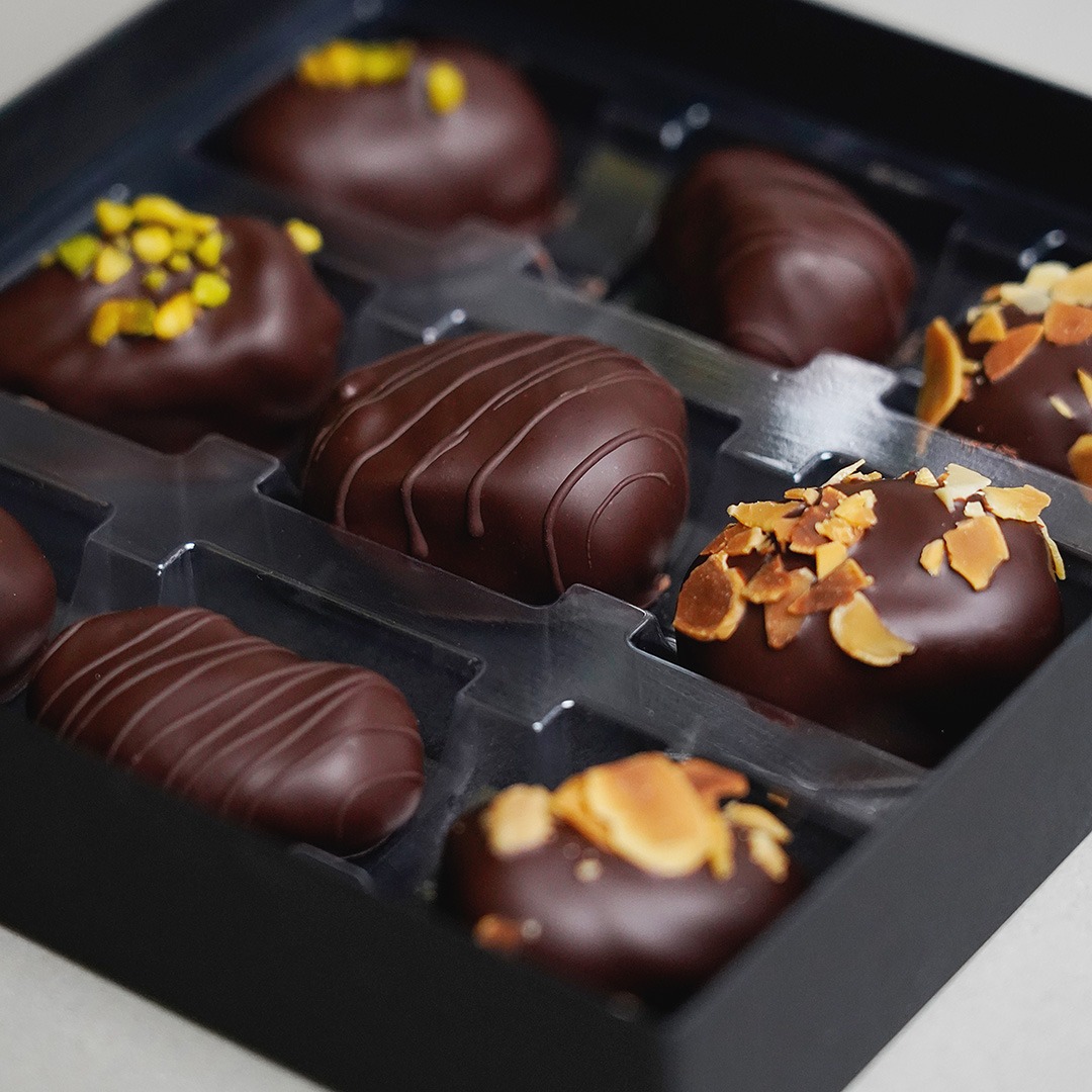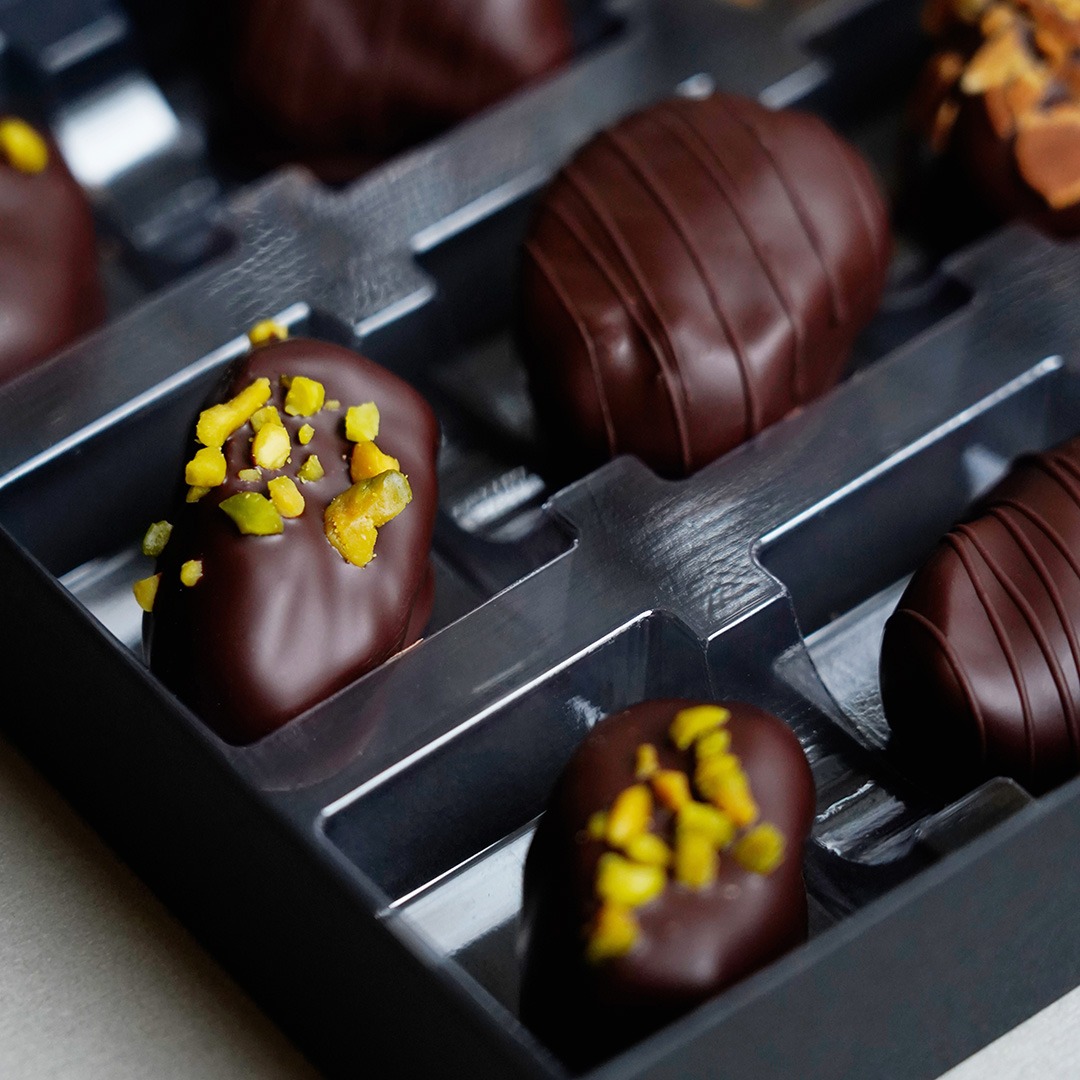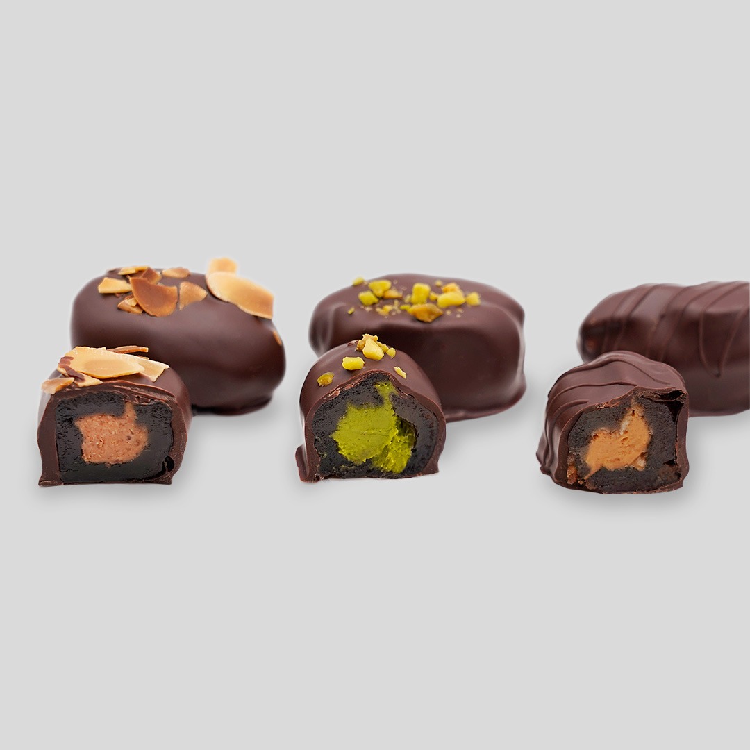 Wir verwenden für unsere Kreationen Mazafati-Datteln, die kleiner, aber besonders weich und aromatisch sind. Ihr natürlich süßer Geschmack harmoniert perfekt mit dunkler Schokolade und cremigen Füllungen. So entsteht ein perfekter Genuss!