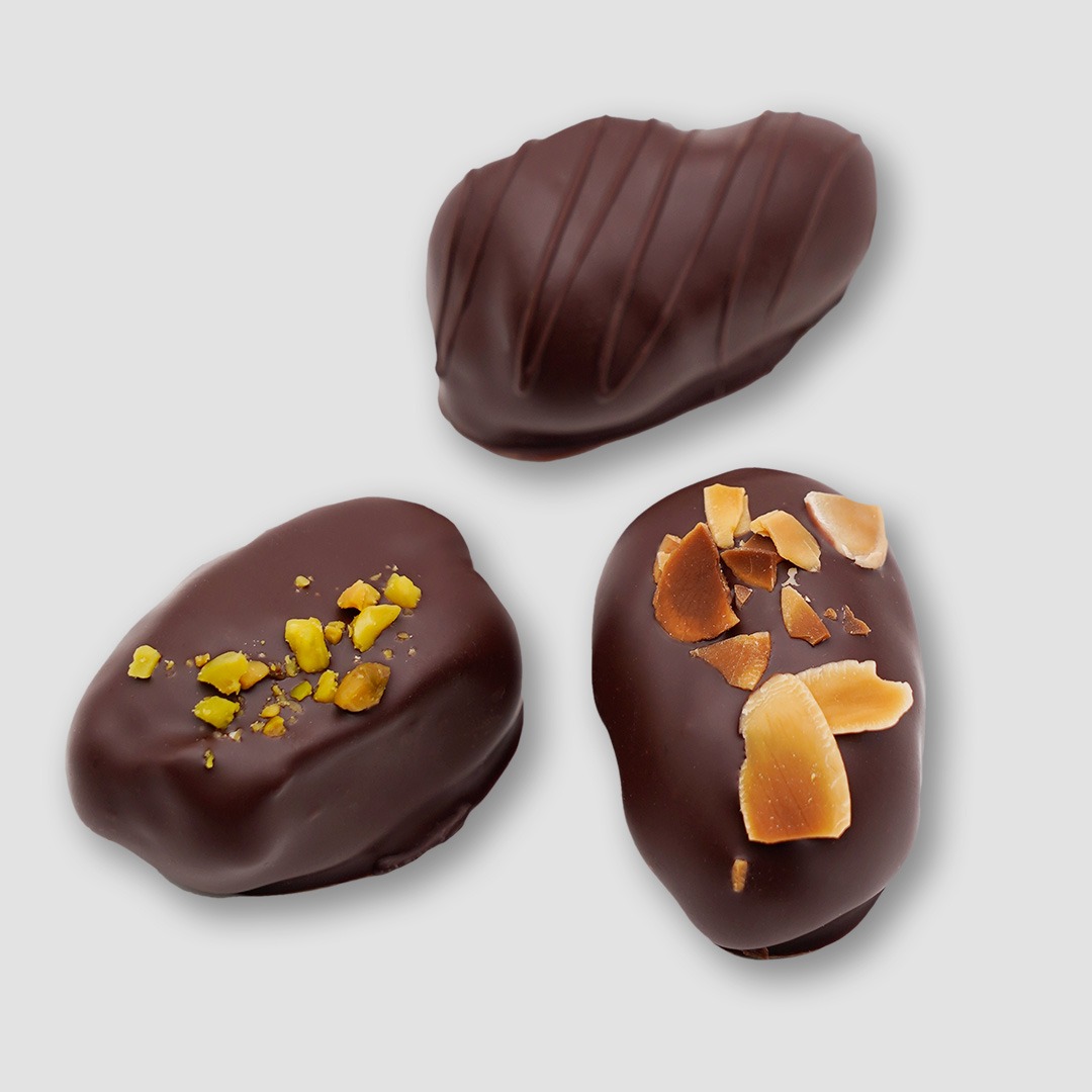 Unsere Schoko-Datteln mit Nussfüllung gibt es in drei köstlichen Varianten: