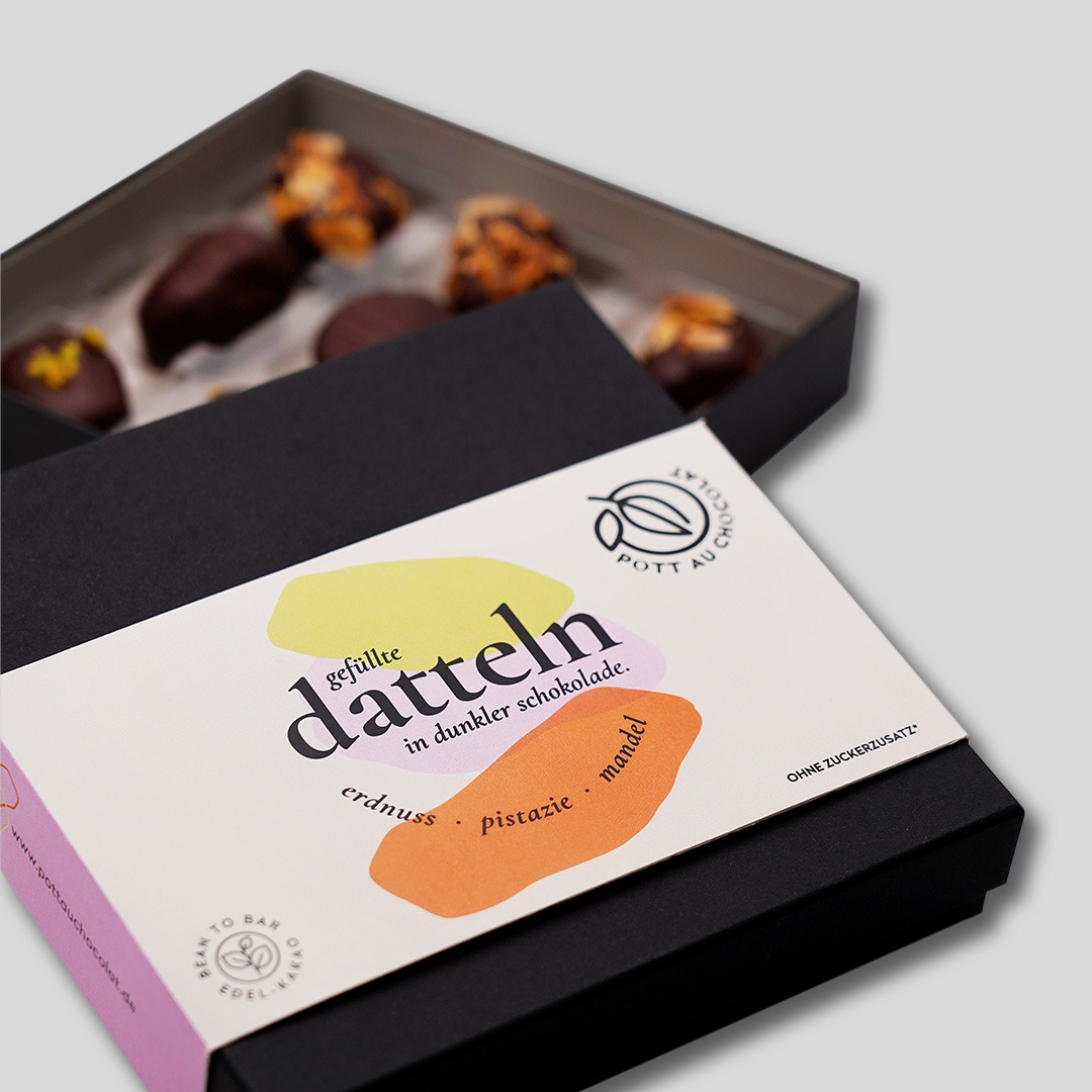 Jede Dattel wird von Hand gefüllt, mit Schokolade überzogen, dekoriert und verpackt. Diese Sorgfalt macht unsere Schoko-Datteln zu einer Spezialität, die man schmeckt – und die sich deutlich von industrieller Massenware abhebt.