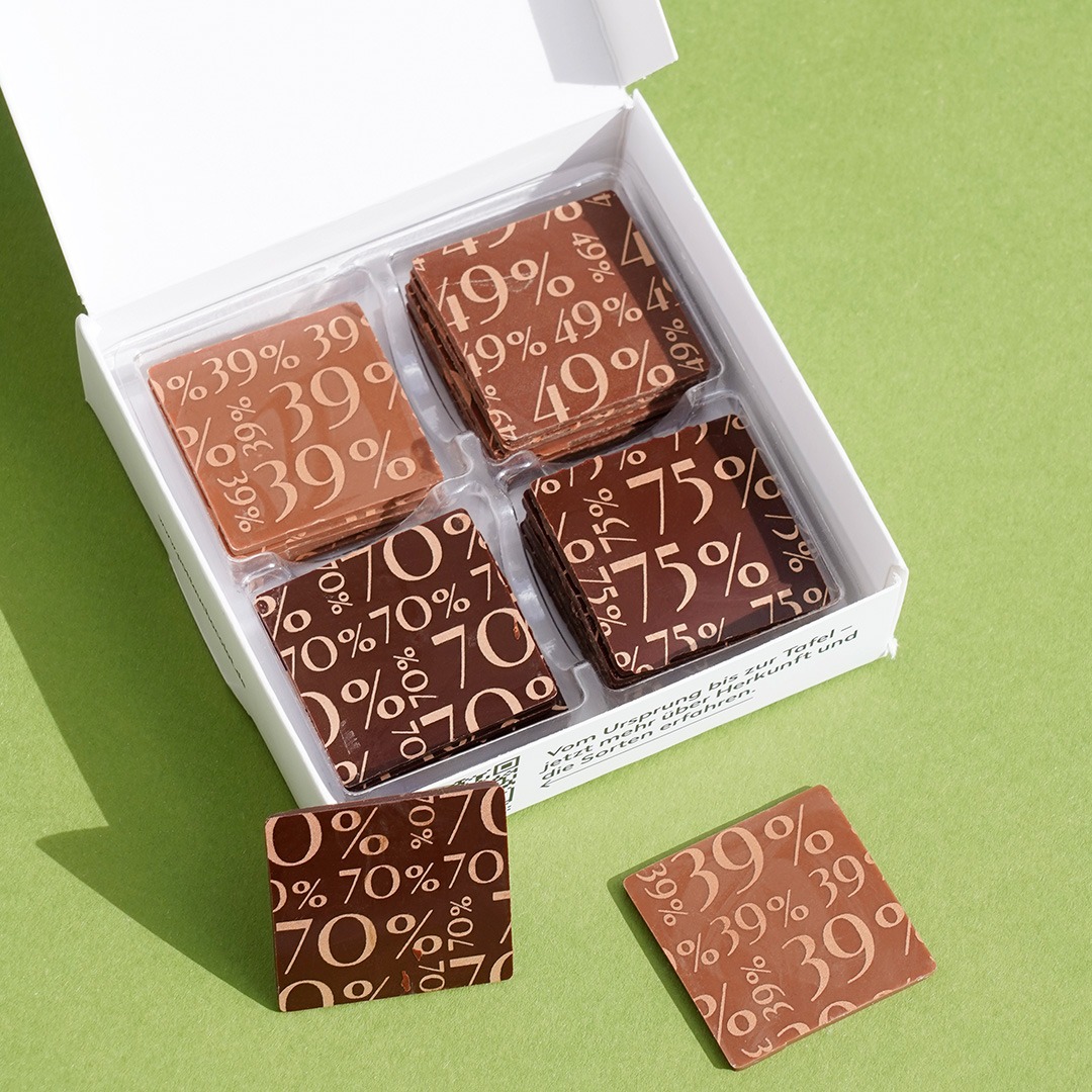 Durch die handliche Größe der Täfelchen kannst du die Sorten nacheinander probieren und herausfinden, welche Variante dein persönlicher Favorit wird. Oder du lässt deinen Gästen die Wahl und bietest ihnen ein kleines, feines Schokoladenerlebnis an. Die sechs Täfelchen pro Sorte sind dabei so portioniert, dass du dich Stück für Stück an den vollen Geschmack herantasten kannst, ohne gleich eine große Tafel öffnen zu müssen.